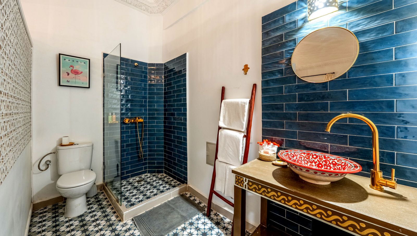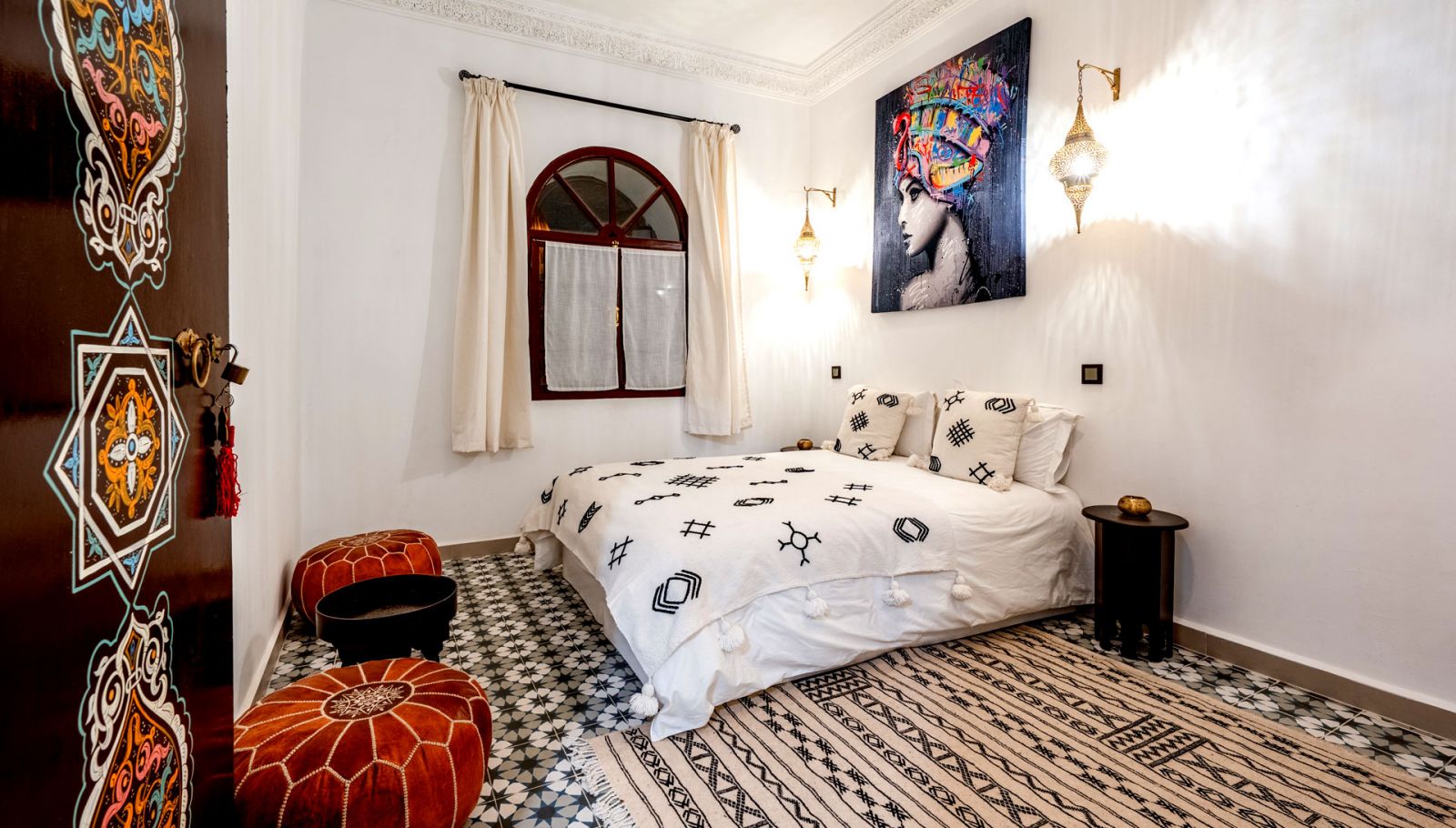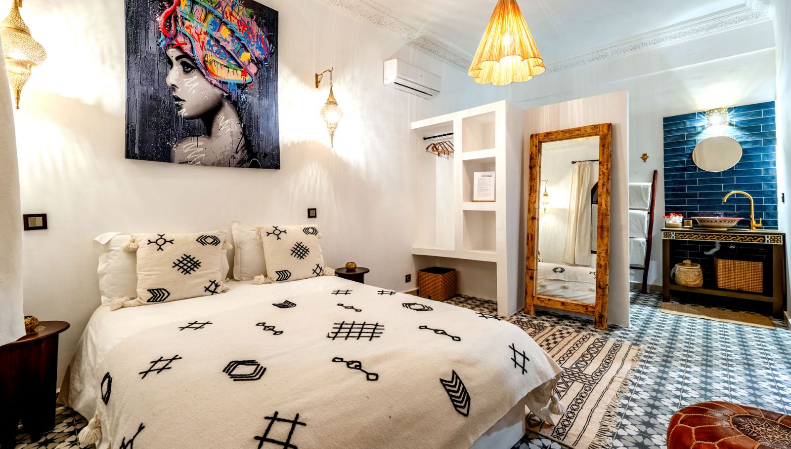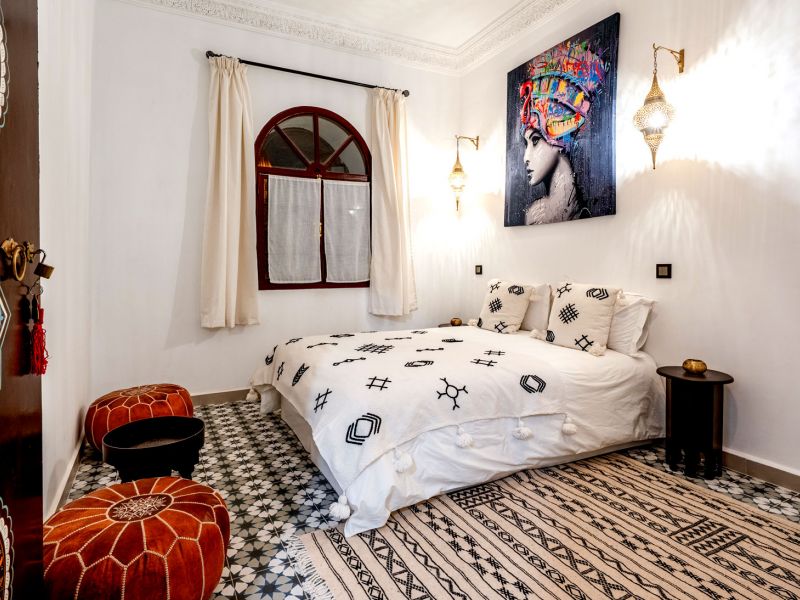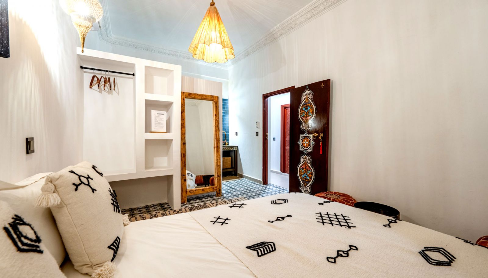 Donnant sur l‘extérieur avec vue sur le derb. La chambre dispose d'un petit coin salon et d une penderie. La salle de bain est très spacieuse et comprend une douche, des toilettes individuelles et un lavabo.
